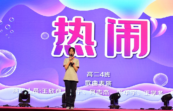 4班同学的《热闹》,一下子让刚才平静下来的同学们再次热闹起来。大屏上投出同学们头顶的摇臂所拍摄的画面,老师们和同学们脸上都洋溢着灿烂的笑容以及看到自己后的惊讶与忙乱。