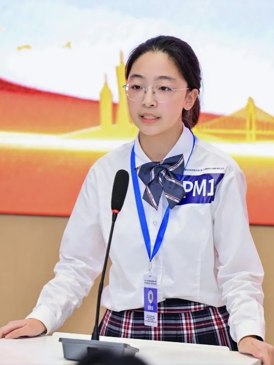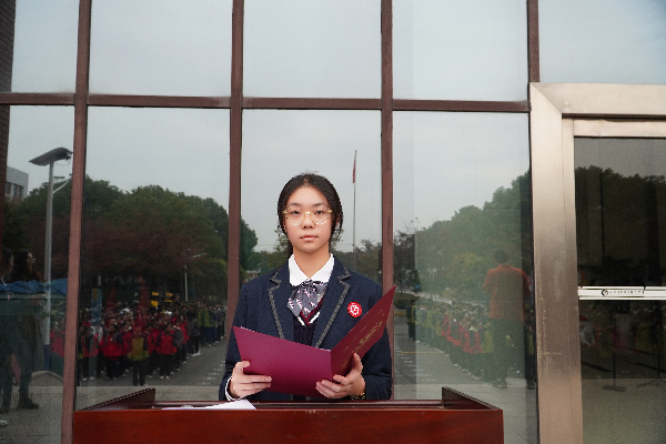 最后,高二8班沈嘉延作为新任学生会主席代表全体成员发言。她首先感谢了全体师生的信任与认可,并向前任学生会成员的付出致以诚挚谢意 。她表示,未来将带领团队以“分工协作、务实笃行”为准则,以“服务同学、赋能成长”为目标,让各部门力量精准落地,搭建好师生沟通的桥梁,用智慧和汗水书写学生会工作的新篇章。