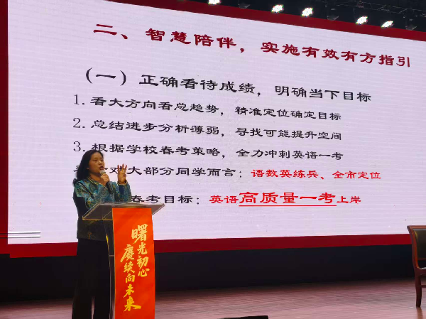 紧接着,杨文英“温情相伴 智慧引路 梦想可抵”为主题,为高三学生家长接下来的重点调整提供了目光长远又切实有效的建议。她明确了创设温馨温暖环境的重要性,同时,建议家长们不仅要引导学生正确看待成绩,更要明确当下目标。她指出,家长们要把握学生心态,把握高考动态,加强家校协作,相信凭借学校、家长的智慧协作,2026 届学子定能在知识的天地里茁壮成长,拥抱梦想。